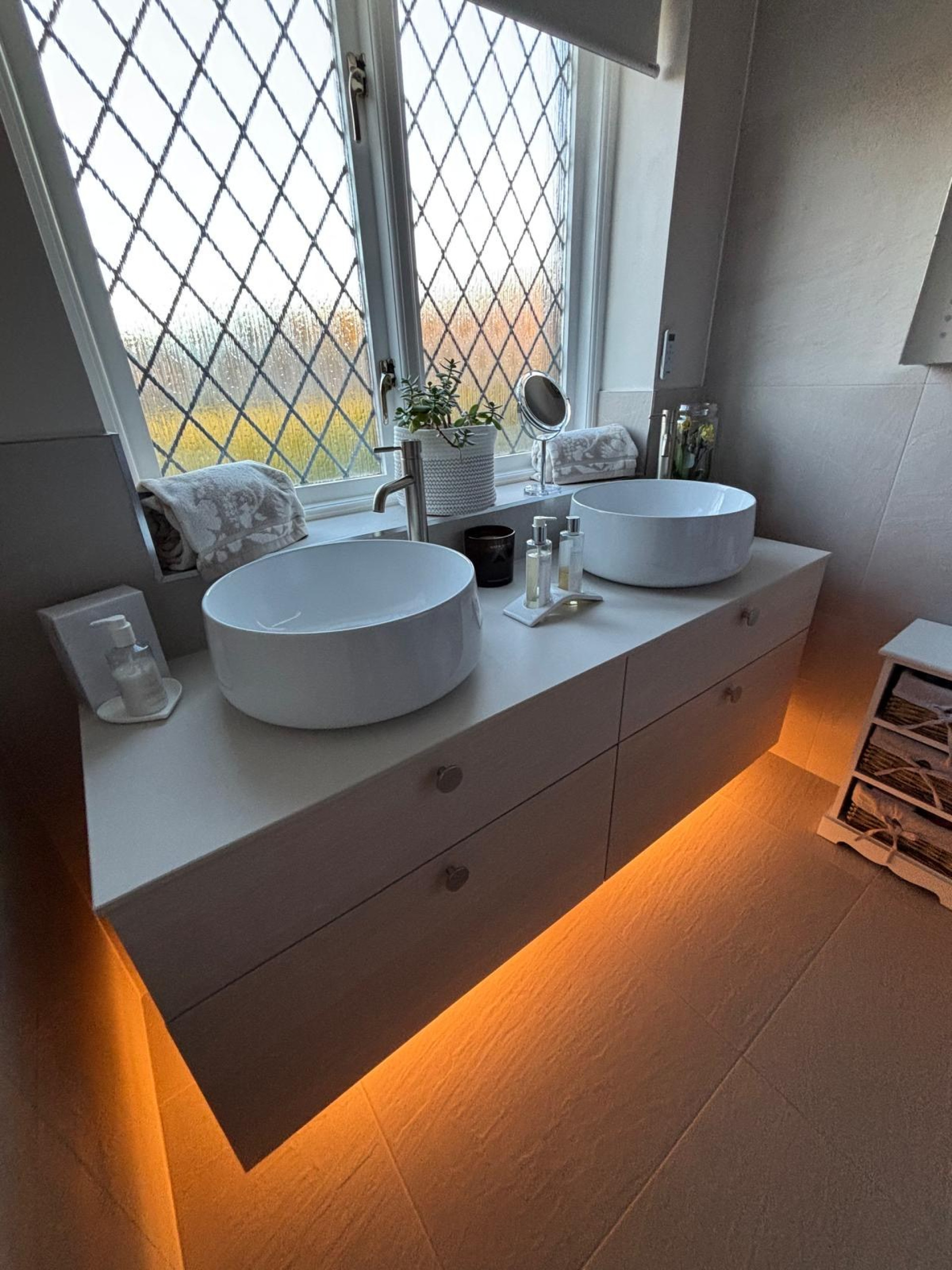 The final bathroom is a serene, spa-inspired space that balances style and practicality. The warm tones, thoughtful lighting, and premium finishes come together to create a haven of relaxation — all while maintaining the storage the client needed.